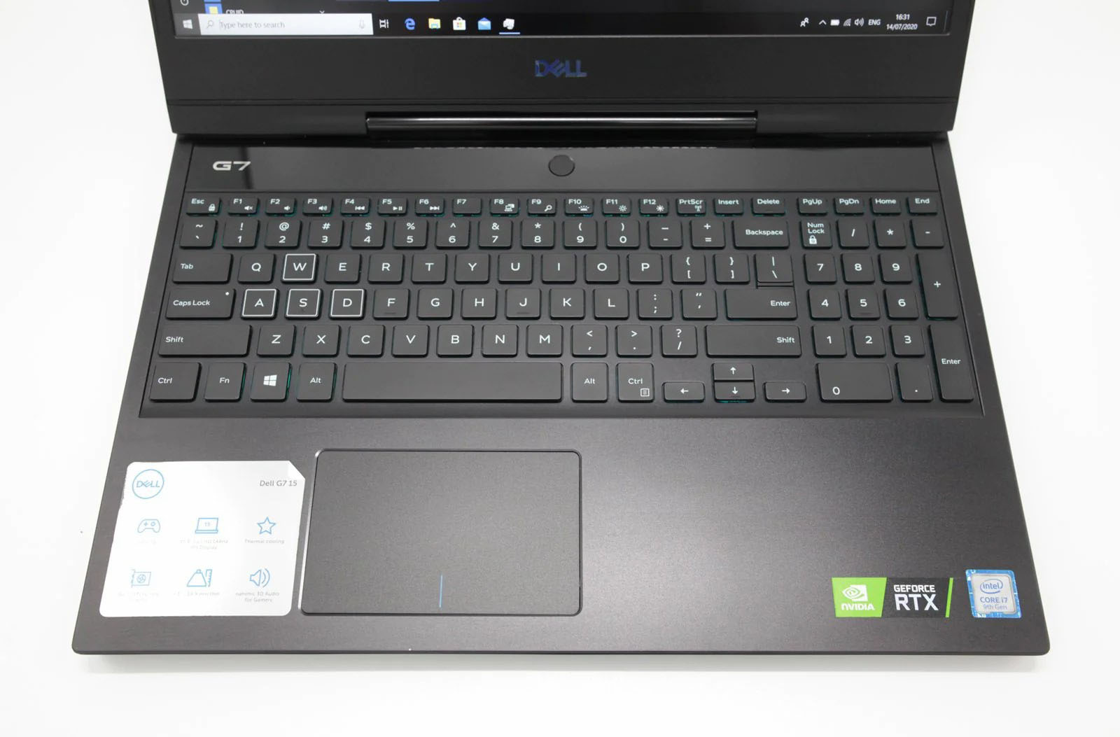 Dell G7 7590 có bàn phím không có nhiều khác biệt với phiên bản trước, máy sử dụng bàn phím full-size, với layout được bố trí khá hợp lý, tuy nhiên hành trình phím hơi nông, nếu sử dụng để gõ văn bản trong thời gian dài sẽ có thể mỏi tay, tuy nhiên nếu để gaming thì rất ổn.