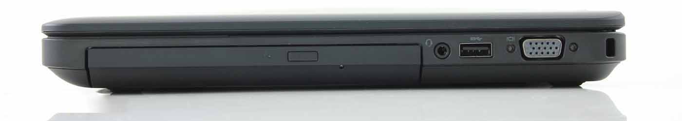 Bên phải là cổng USB 3.0, cổng VGA, ổ ghi DVD, khe khóa Kensington và cổng cắm headphone/microphone kết hợp.
